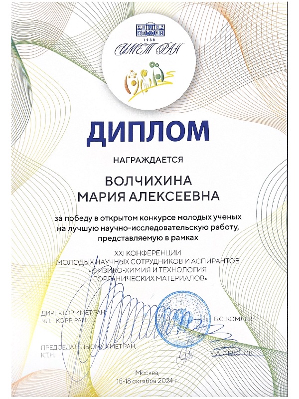 Дергачева Полина Евгеньевна, группа МТ8-31М, получила диплом за лучший доклад на тему: «Ионно-транспортные мембраны на основе композитов In2-xZrxO3 – Bi2O3»