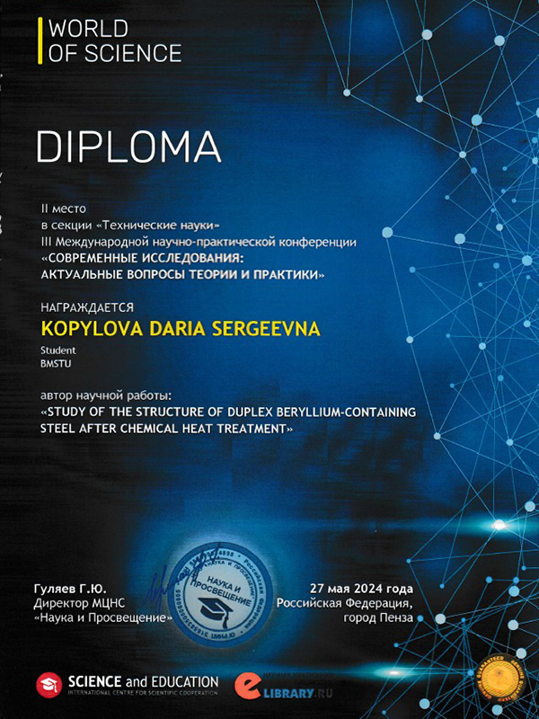 Студентка группы МТ8-81Б Панина Кира Сергеевна получила диплом I степени за научно-исследовательскую работу «Разработка технологии получения наноструктурированных твердых сплавов на основе ВК-15»